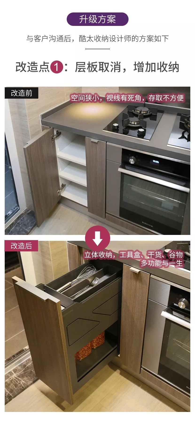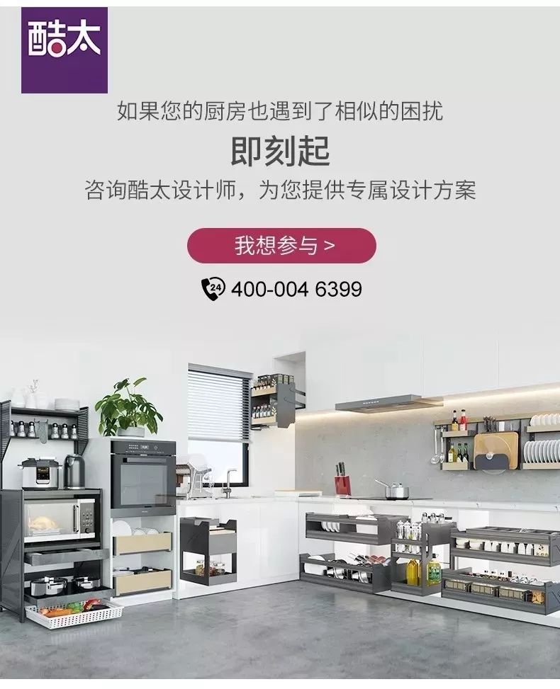 酷太坚持8年自主研发,已获得专利证书130项,拥有一套领先市场的厨房收纳系统,为千万中国家庭解决厨房脏乱差,缔造厨房新生活。
