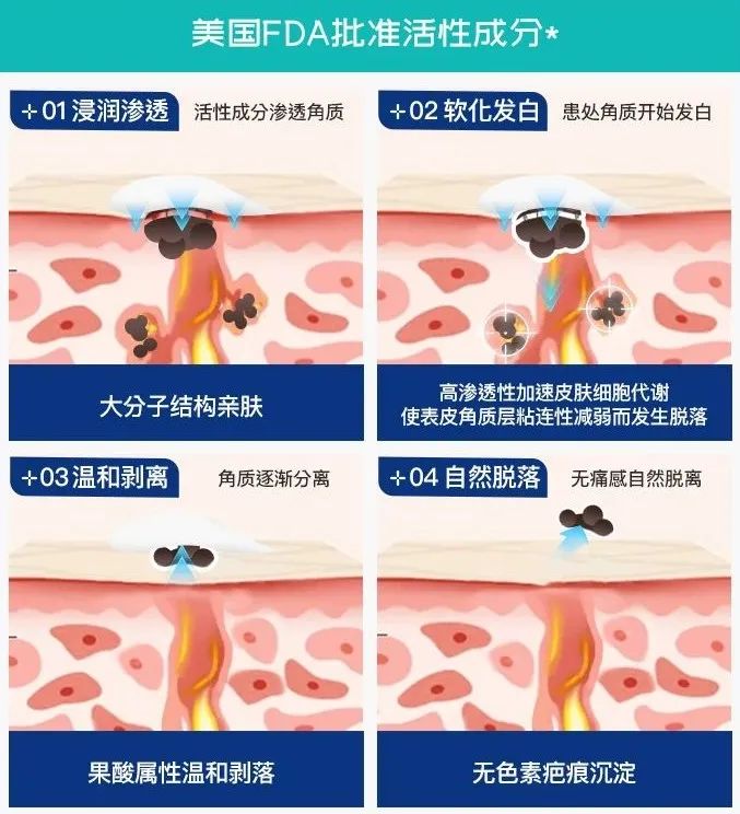 1.水杨酸(美国FDA批准活性成分)+D-扁桃体酸:可以快速渗透进入肌底,软化并剥脱疣部位增厚的角质层,无痛去疣的同时,促进肌肤新陈代谢,避免留疤。
