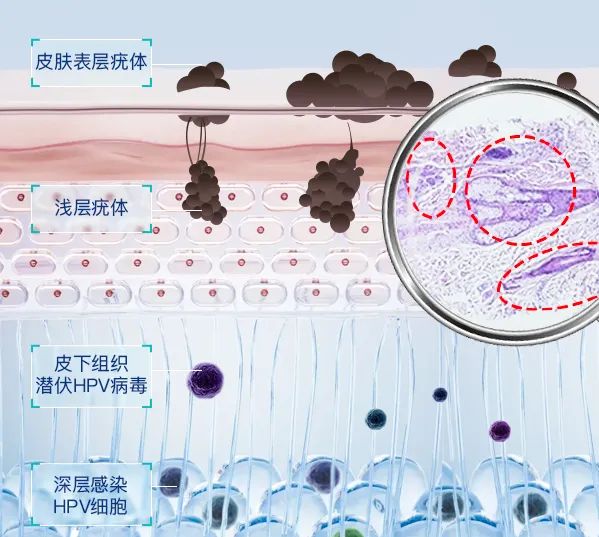 研究显示:表皮肉眼可见疣体只占据病毒的20%,皮下细胞组织疣体深层的占据80%。
