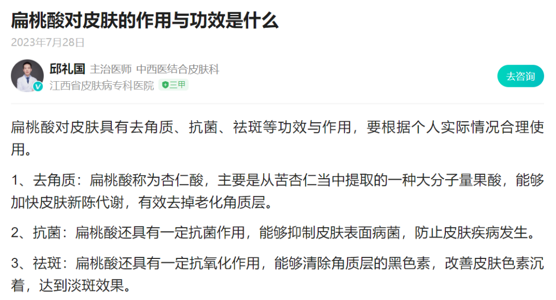 D-扁桃酸则有着高渗透性,能够加速皮肤细胞代谢,使表皮角质层粘连性减弱而发生脱落。