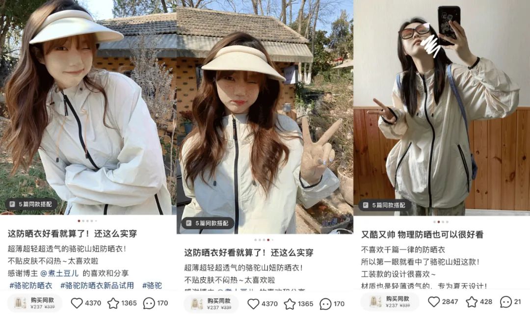 也就是说,很有可能花几百块买了一顶毫无防晒能力的长袖,在闷热的夏天只能用来自我安慰...