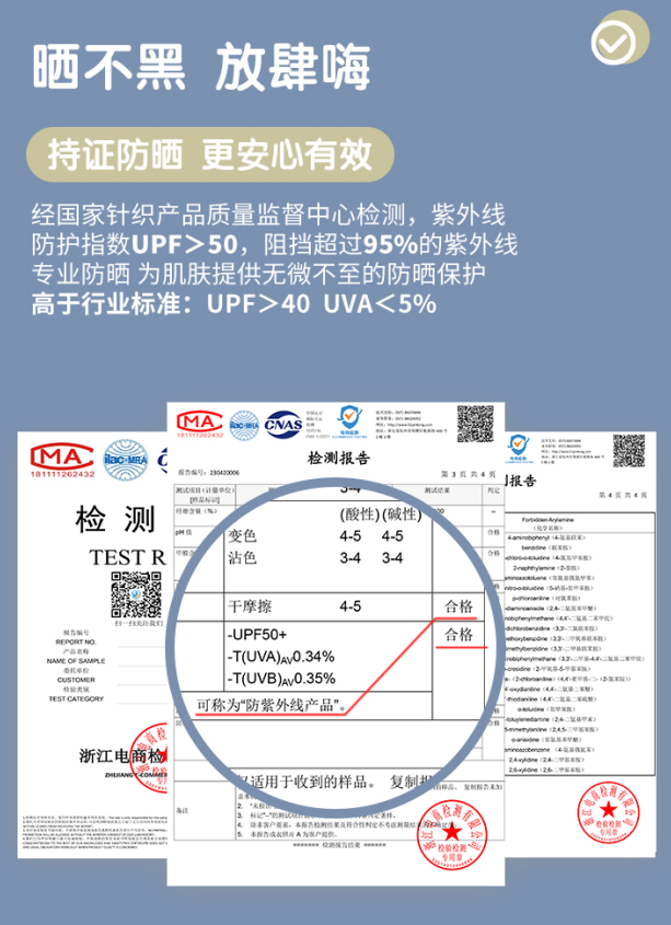 ⭕符合规定的《纺织物防紫外线性能的评定》。