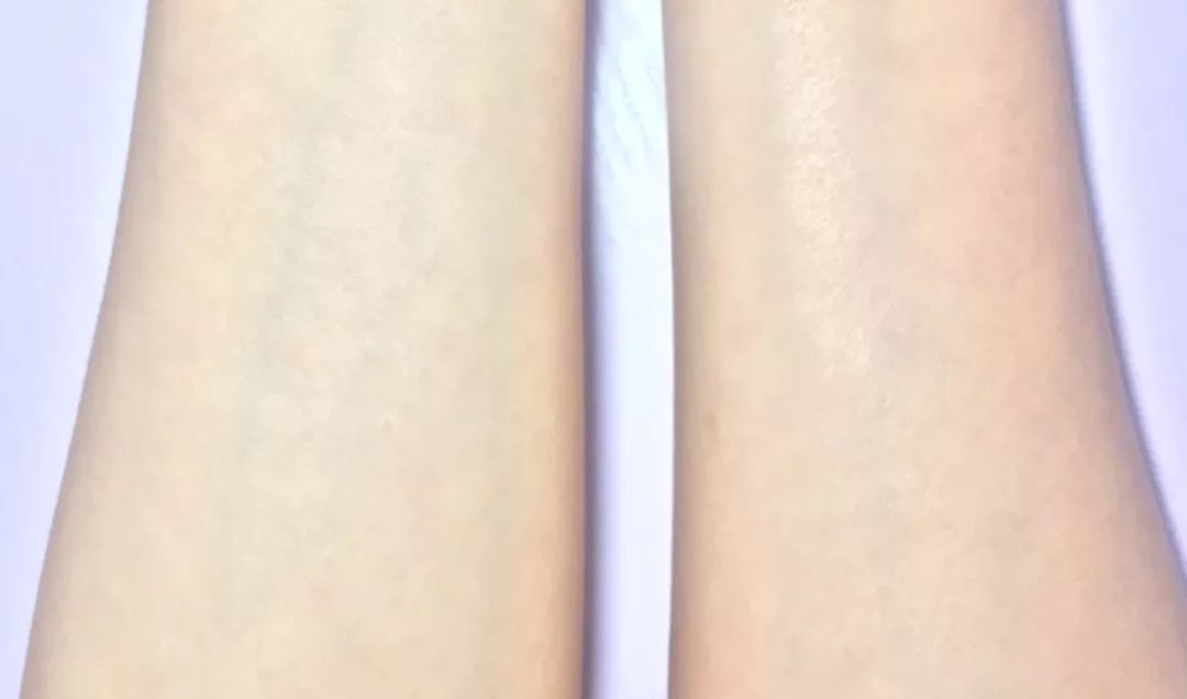 它很容易推开,抹匀后,皮肤像喝了水一样滋润。用清水或搭配少量沐浴露即可洗净。对比没有涂抹的右手臂,抹过的那一侧肤色更亮。