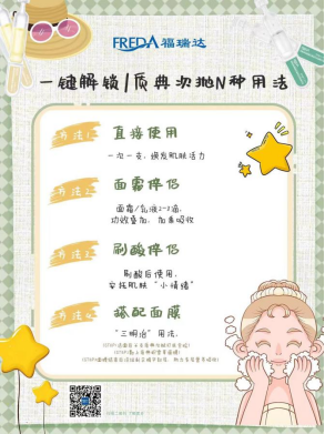 使用方法:每日早、晚于化妆水后使用,取适量精华液于掌心,由内向外,从下向上涂抹于整个面部,轻轻打圈按摩至充分吸收。