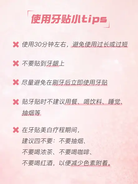 ✘ 在牙贴美白期间,建议四不要:不要抽烟、不要喝浓茶、不要喝咖啡、不要喝红酒,以减少色素附着