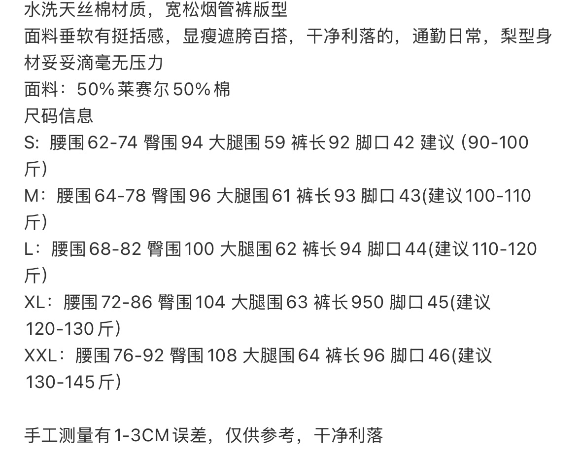 水洗天丝棉材质,宽松烟管裤版型面料垂软有挺括感