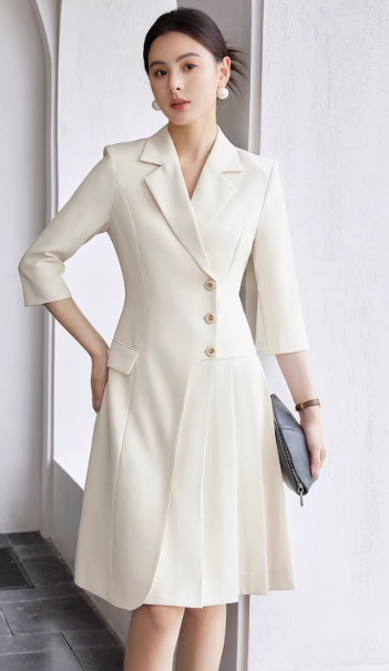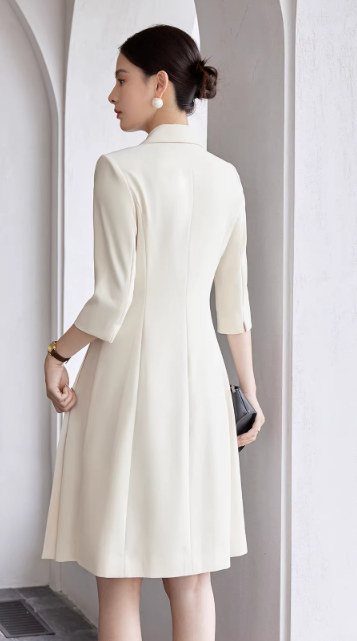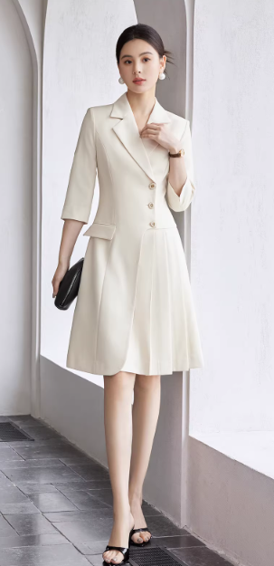 把温柔气质穿在身上,通勤也能优雅动人。这款米白西装裙,摒弃刻板职场装,用柔和色调与灵动剪裁,平衡正式感与柔美度,尽显女性魅力。
