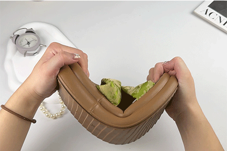鞋料真的太软啦!看到这个鞋底了吗?采用的是高回弹的记忆材料填充,软而不失弹性,按压起来软嘟嘟的。