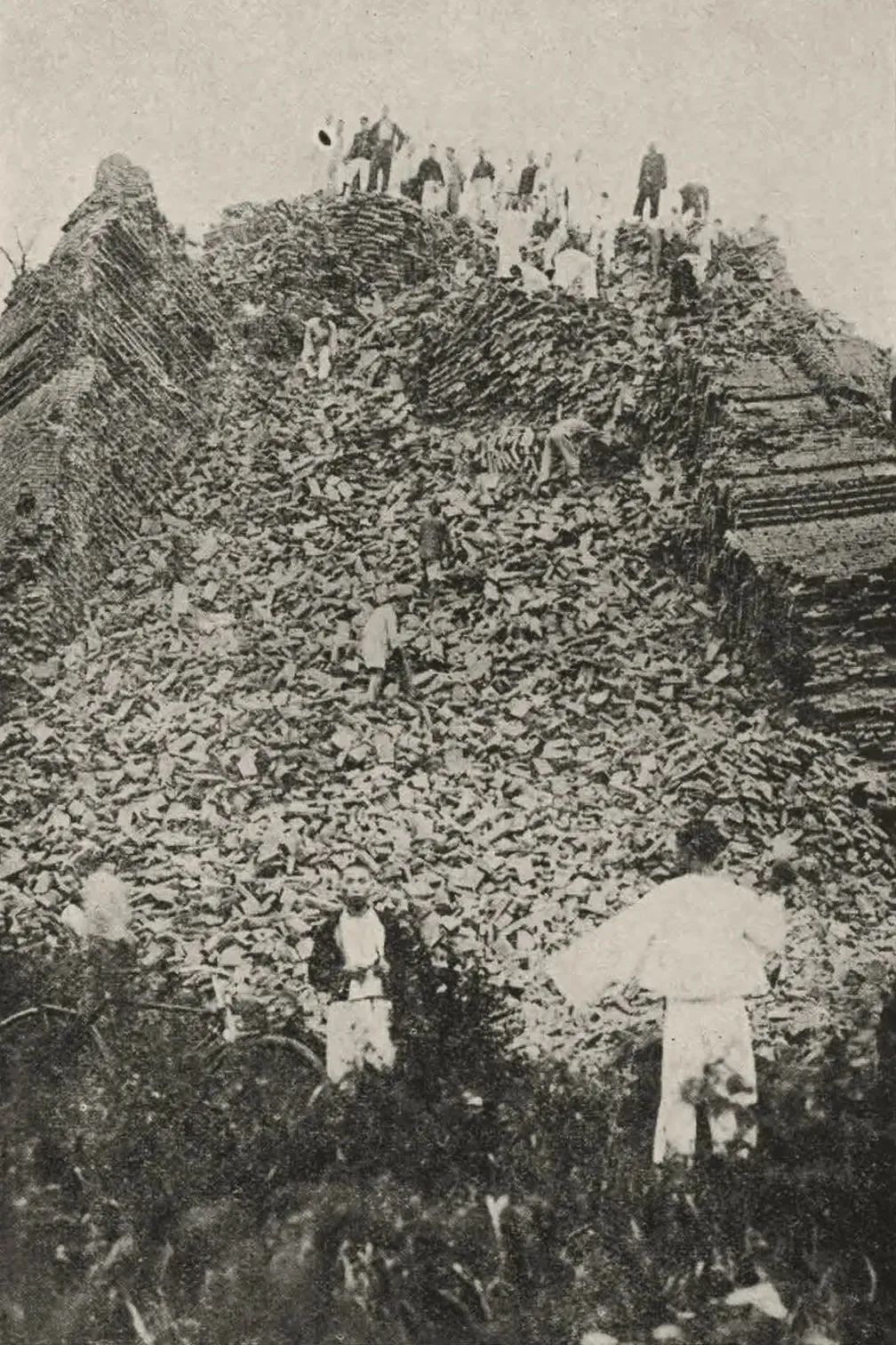...…纵目徘徊,惟见亿砖层累作峨峨黄垄而已。游人杂沓,填溢于废基之上,负砖归者甚多。