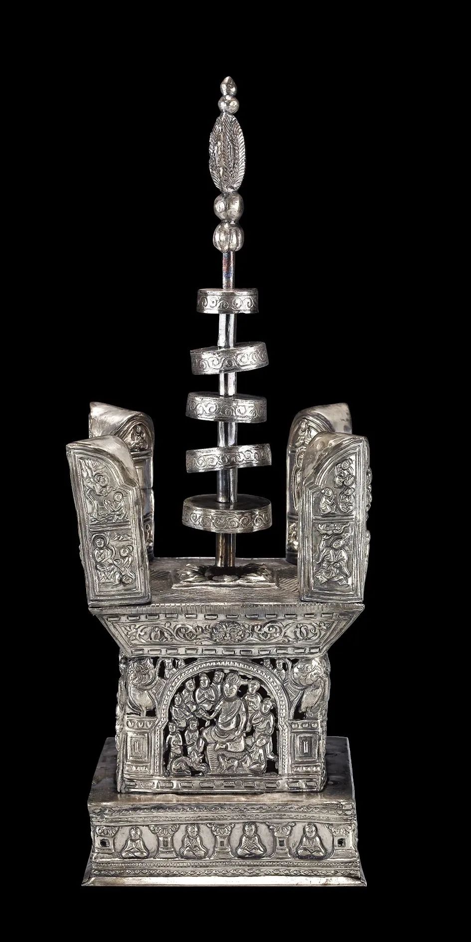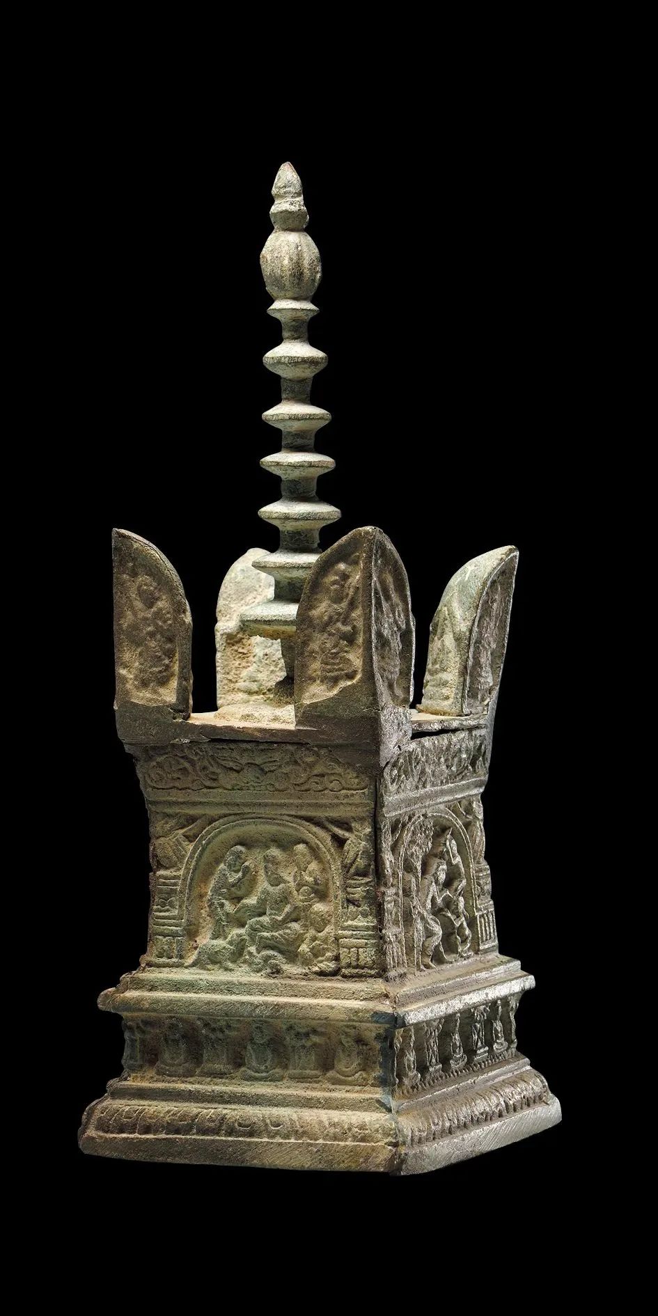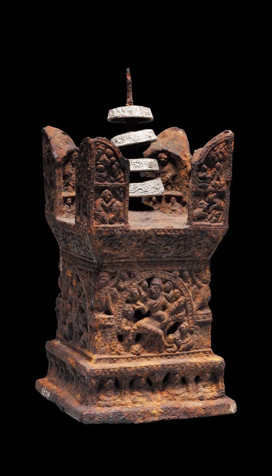 北宋乾德三年(965)铸铁质鎏金阿育王塔,刻宝箧印陀罗尼经;