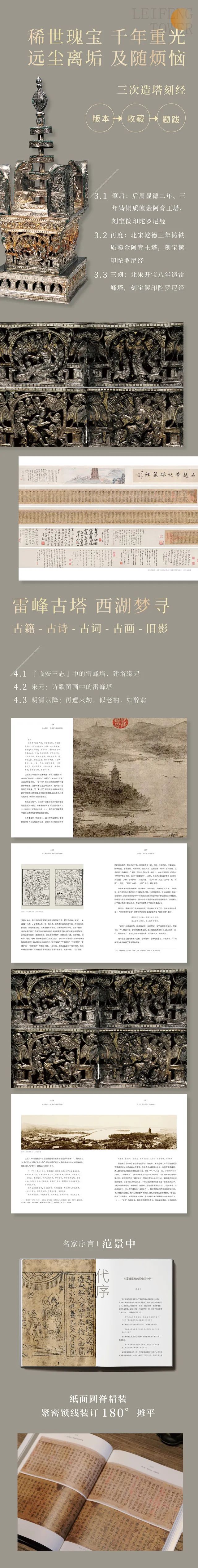 《远尘离垢:雷峰塔与雷峰塔所藏》,作为目前关于雷锋塔最全故事集,还将为你讲述雷锋塔建成—倒塌—文物发掘及后续的千年故事;雷峰塔圮经出后,经的去向、版本、收藏名家、题跋意义;还会以史实、诗词、文物、经卷为依据,讲述了雷锋塔及其所藏的文化内涵。