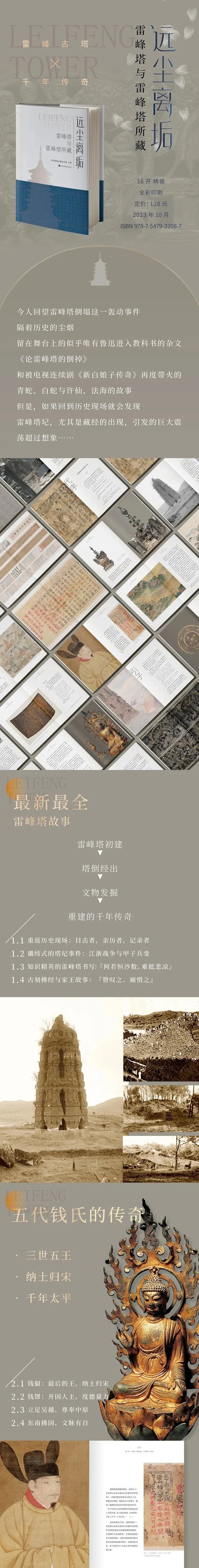 《远尘离垢:雷峰塔与雷峰塔所藏》,将从目击者、亲历者、记录者的角度,用140余幅古画、老照片、文物高清图版,为我们揭开关于雷锋塔建—塔倒—文物发掘及后续的千年传奇,揭秘塔圮经出后,雷峰塔经的去向、版本等一系列疑问——