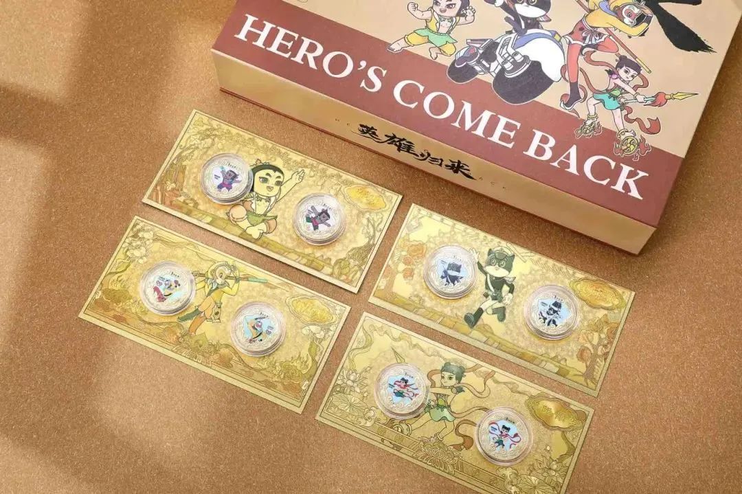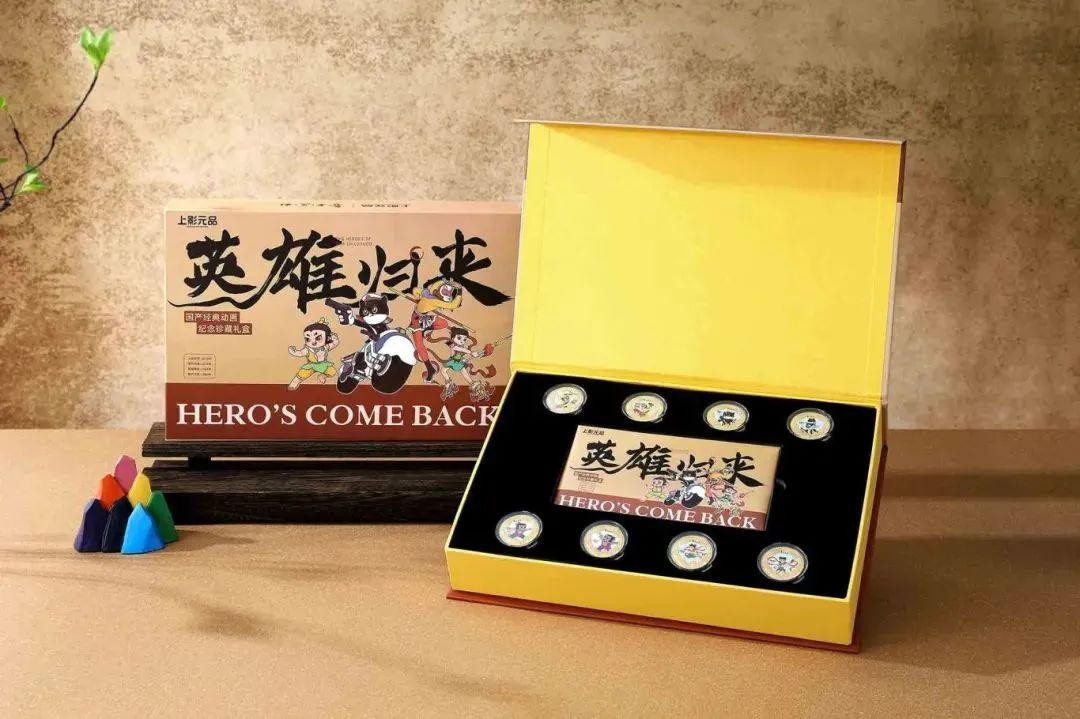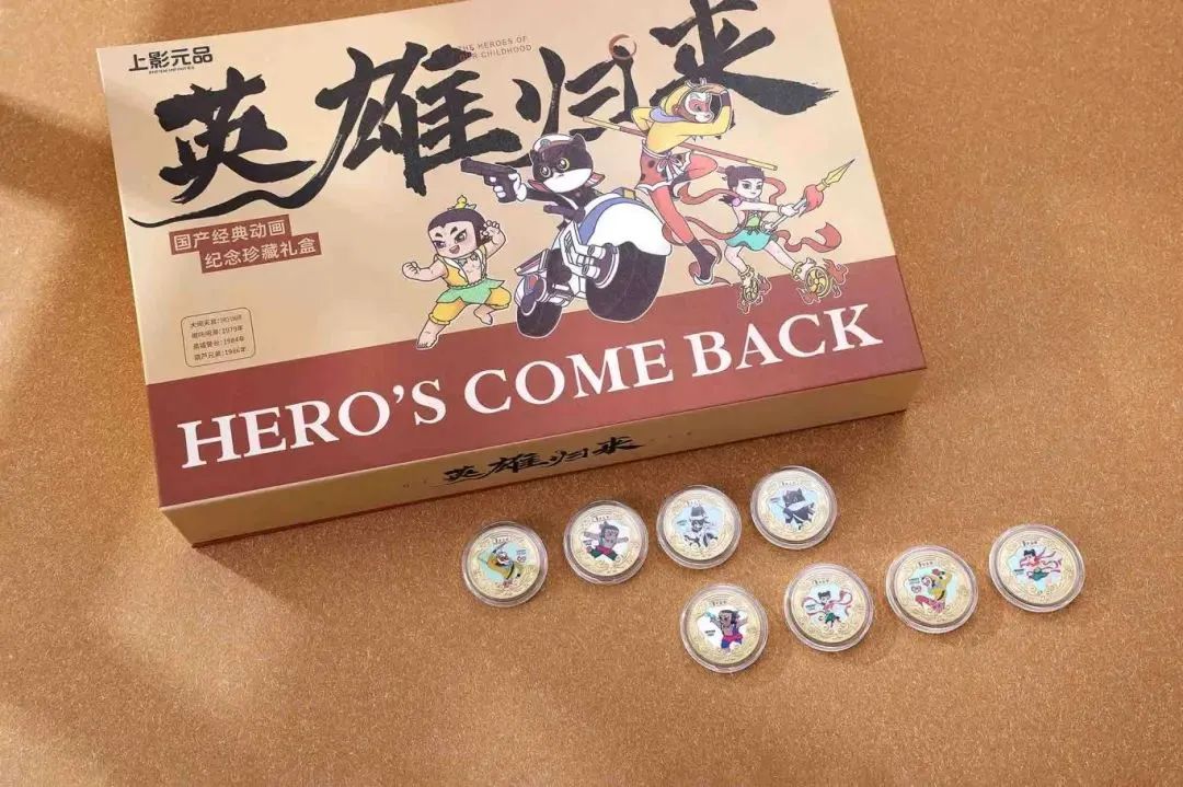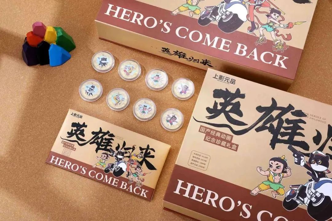 所以,《英雄归来》礼盒中一共含有8枚动画英雄纪念章:大闹天宫2枚、哪吒闹海2枚、黑猫警长2枚,葫芦兄弟2枚。