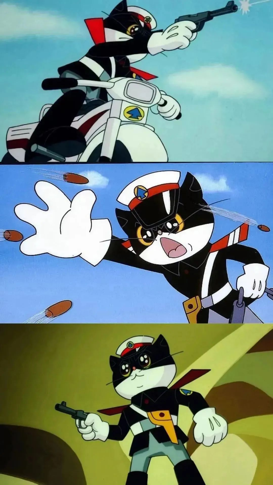 《黑猫警长》2张,一张是出警时面对黑恶势力不屈不挠的战斗画面,另一张是看到队友时开心赶上的画面,哪一张都是我们最喜爱的正直又勇敢的黑猫警长呀~