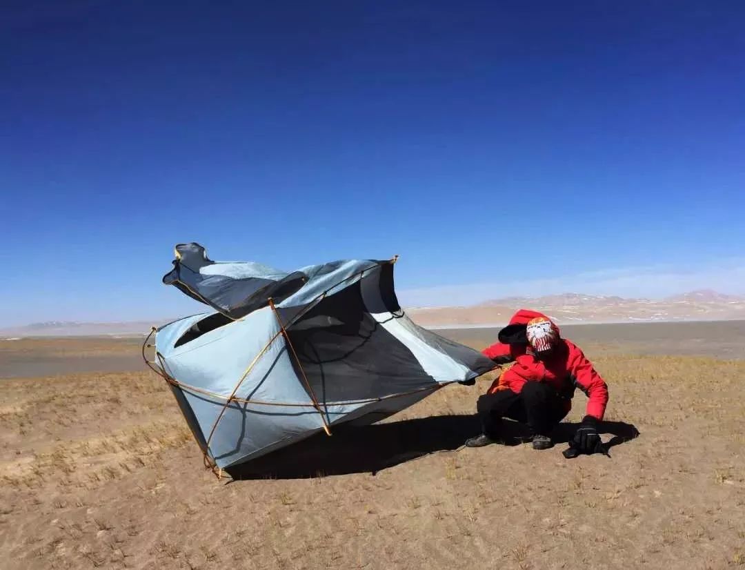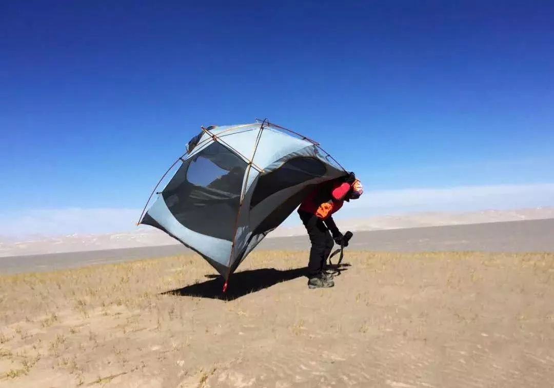 无人区外一个人搭帐篷1分多钟就能搞定,无人区内风大时两个人要耗费十几分钟。