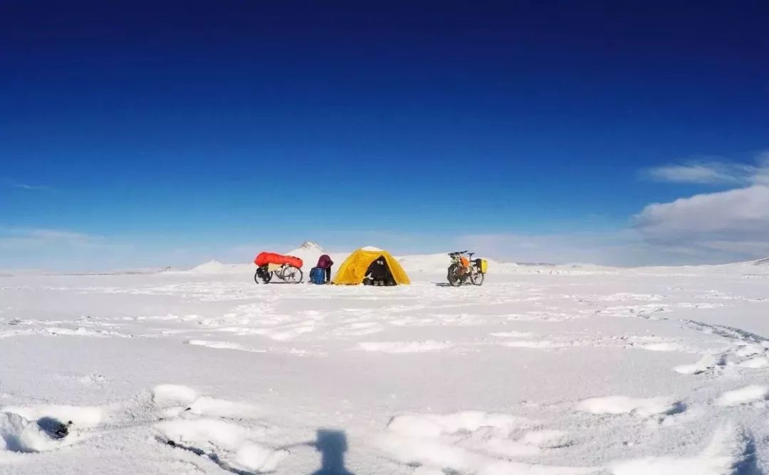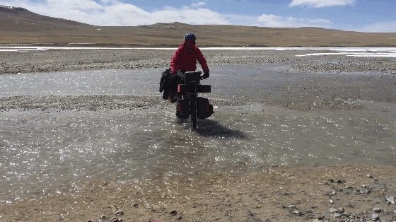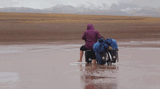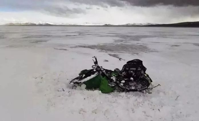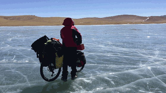 过冰面8次,最长冰面18公里。由于没带冰爪,稍不注意,负重百斤的自行车就会倒地,反正出羌塘时,我们的膝盖都是紫的。