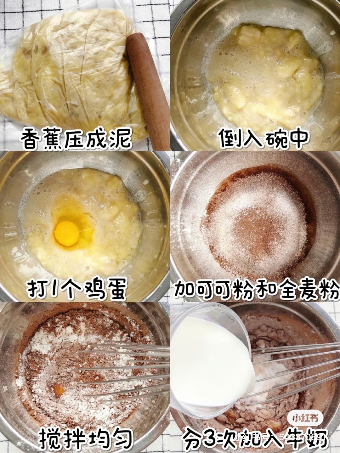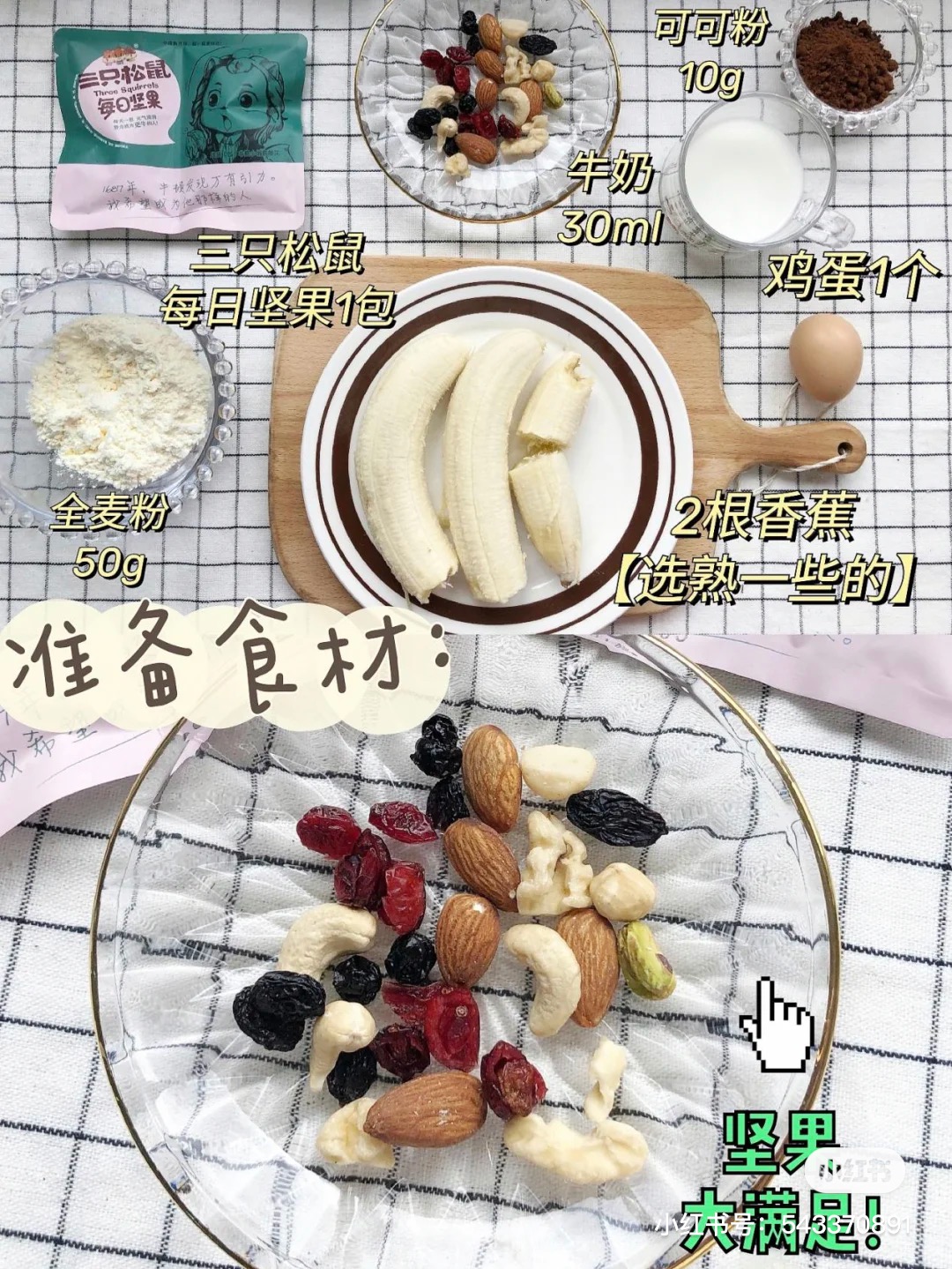 香蕉2根、全麦粉50g、牛奶30ml、可可粉10g、鸡蛋1个、三只松鼠每日坚果1包