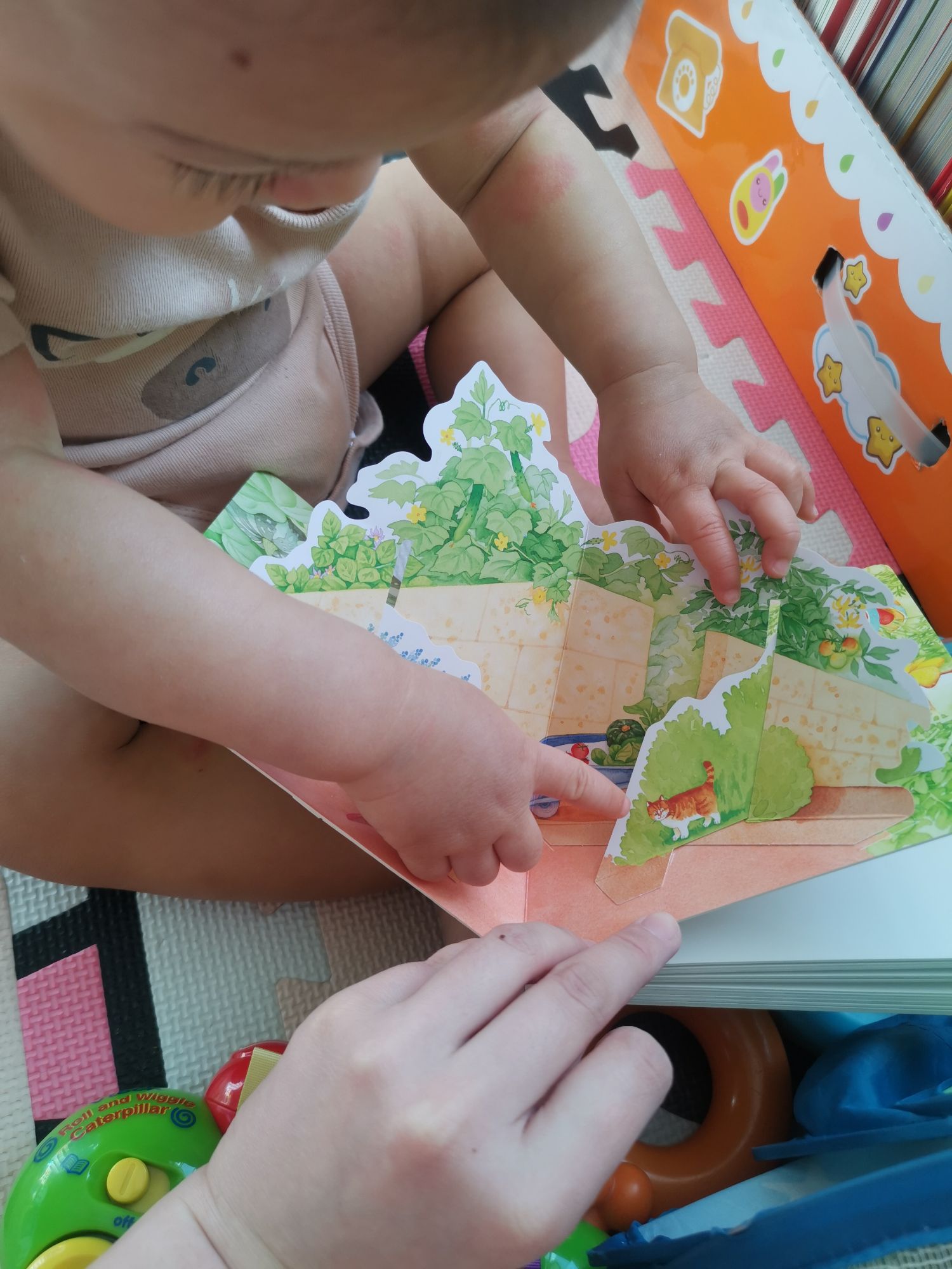 我家宝宝还从《好吃的蔬菜从哪来?》的最后一页,发现了一只小猫,还有浇花的水壶,他特别开心,指着说“猫咪”“壶”,他不说我都没发现立体那页从后面看还有小猫~细节真的好到位!