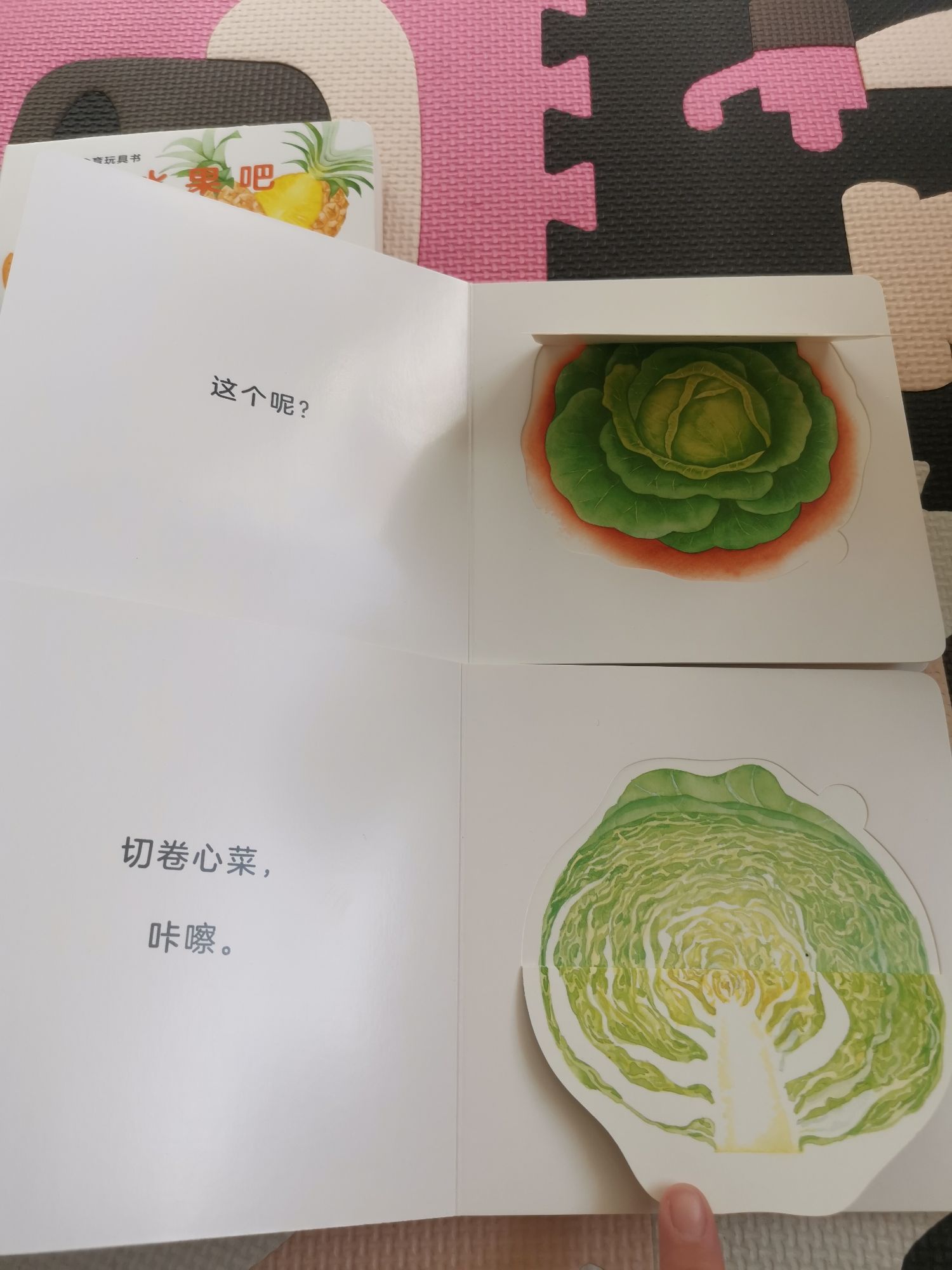 讲到切卷心菜,就从《好吃的蔬菜从哪来?》找到卷心菜,假装扭下来,洗干净,