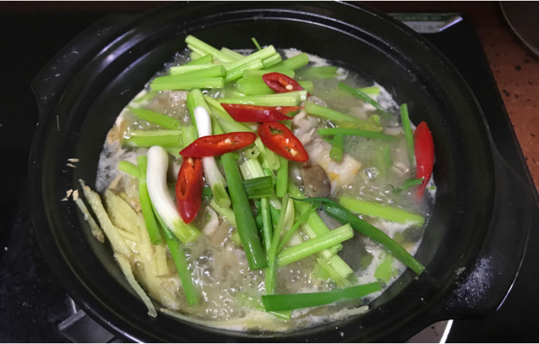 4.将切好的姜丝、芹菜、小葱、辣椒放锅,炖5分钟。