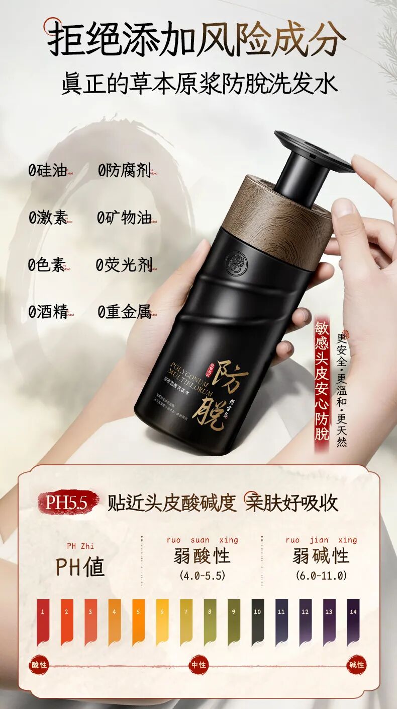 无硅油、无防腐剂、无激素、无矿物油、无色素等8大零添加,PH5.5贴近头皮酸碱度,真正做到温和天然,敏感头皮也能安心使用。