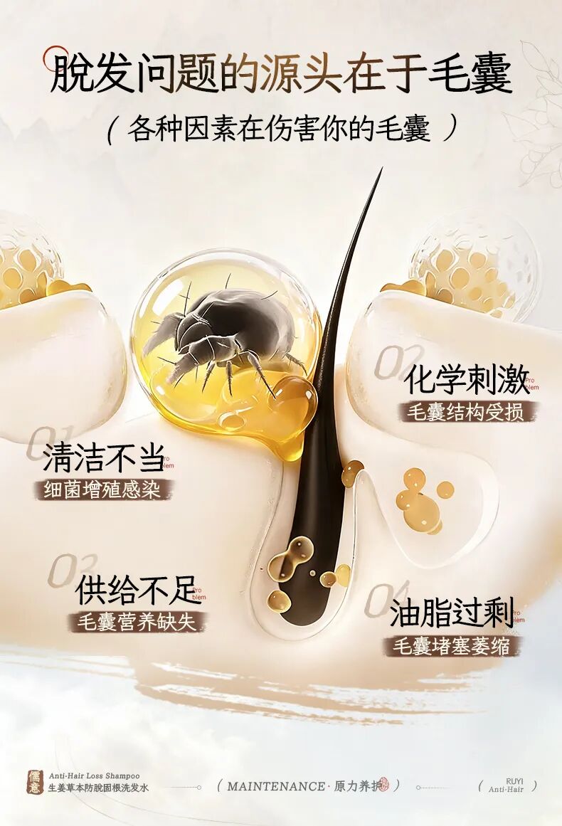 清洁不当,细菌感染;供给不足,营养缺失;化学刺激,结构受损;油脂过剩,堵塞萎缩……毛囊倒了,头发怎能站得住?