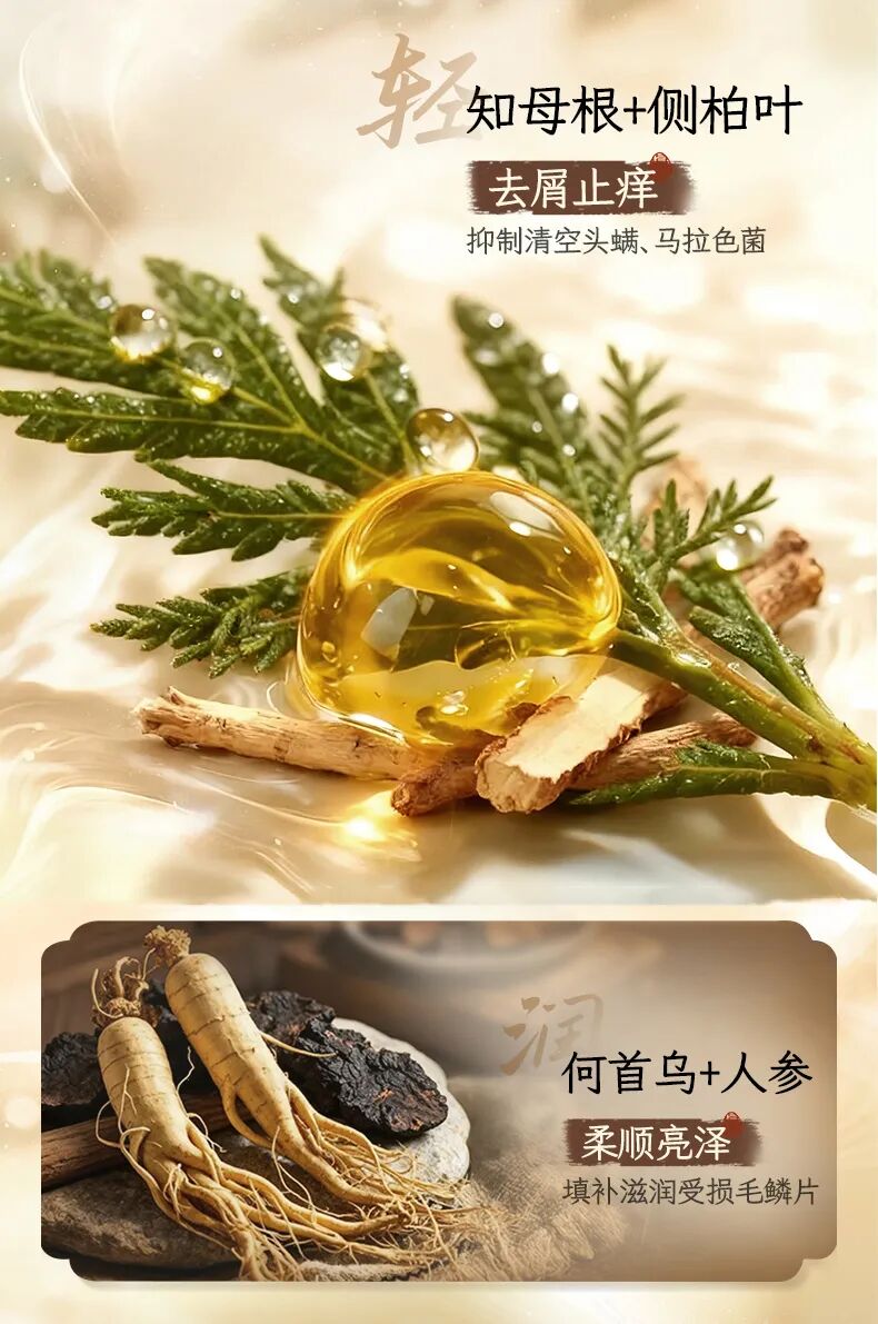 更添加何首乌、人参、知母根、侧柏叶四味草本原浆,协同作用,去屑止痒、抑菌除螨、柔顺亮泽,为毛囊创造一个健康的生长环境!