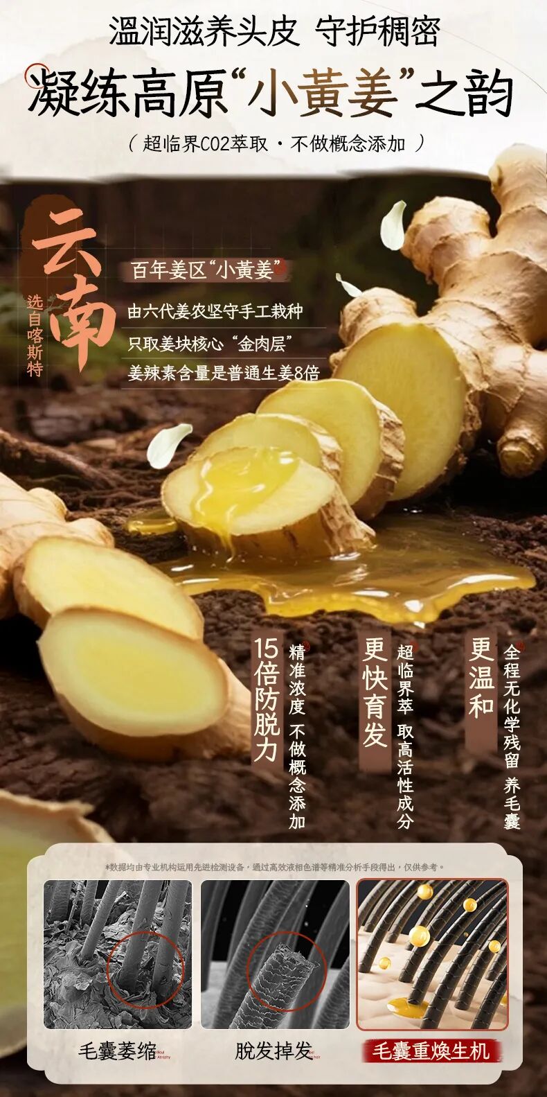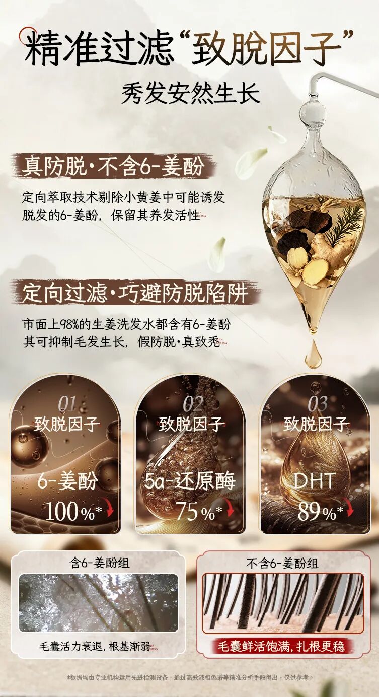 我们采用定向萃取技术,精准剔除6-姜酚,只保留养发活性成分,从源头避免“假防脱,真致秃”的风险!