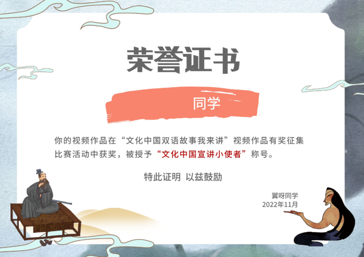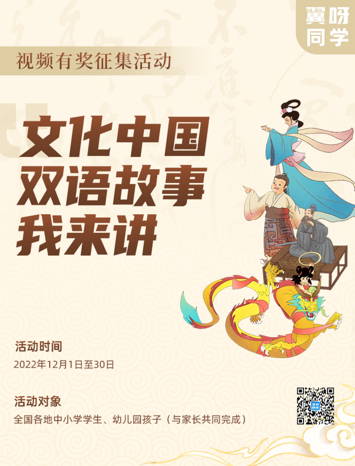 为传承和弘扬中华优秀传统,让孩子们用跨文化视角来讲好中国故事。翼呀同学于2022年12月1日推出“文化中国·双语故事我来讲”——视频作品有奖征集活动。
