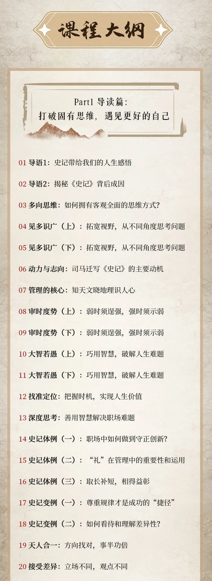 课程中不会简单枯燥地罗列时间、地点、人物,而是通过上下几千年的重要事件与人物,激发现代人的解读和思考,以激起大家的兴趣。