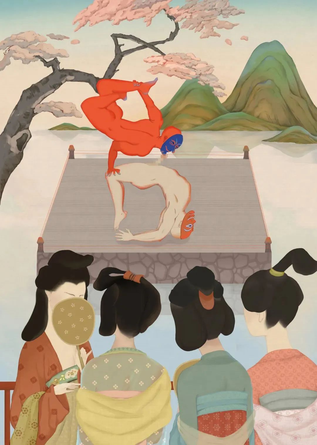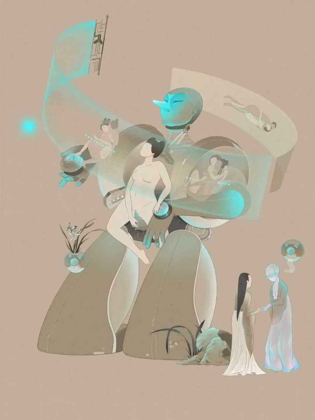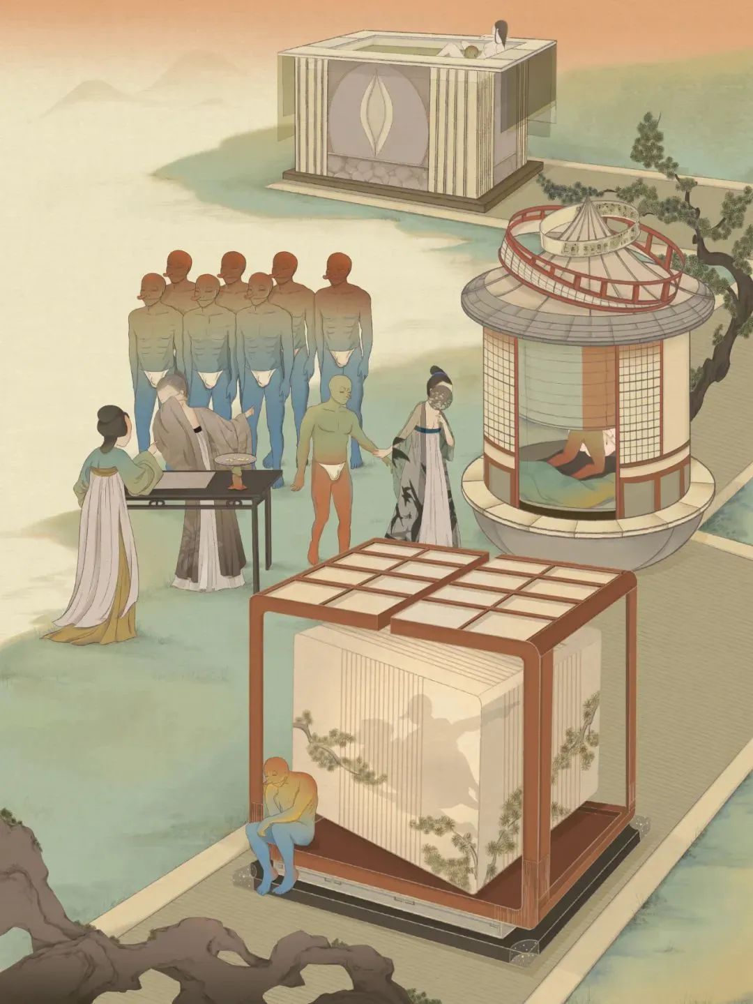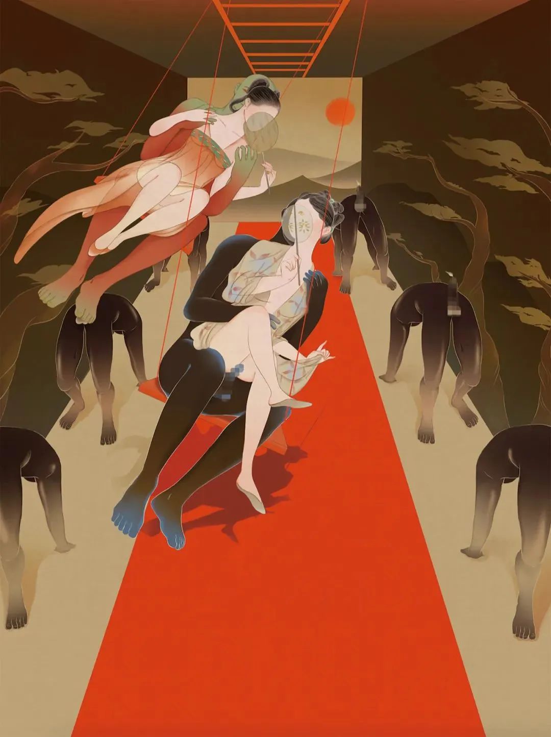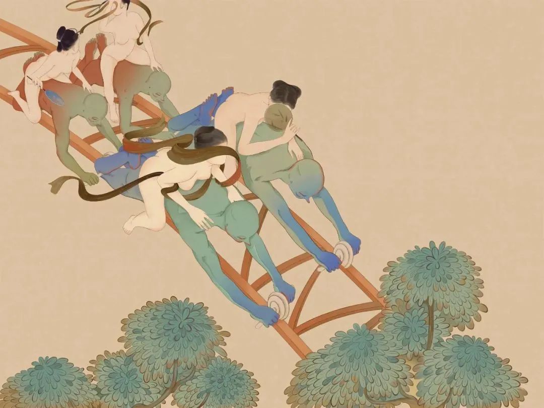 以男性生殖器官为山,渺小的赤身女子穿梭其中,
