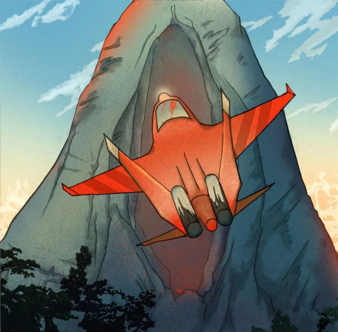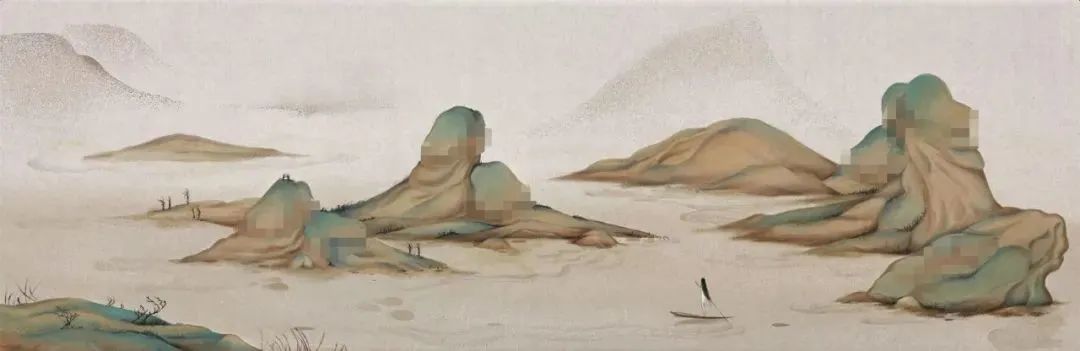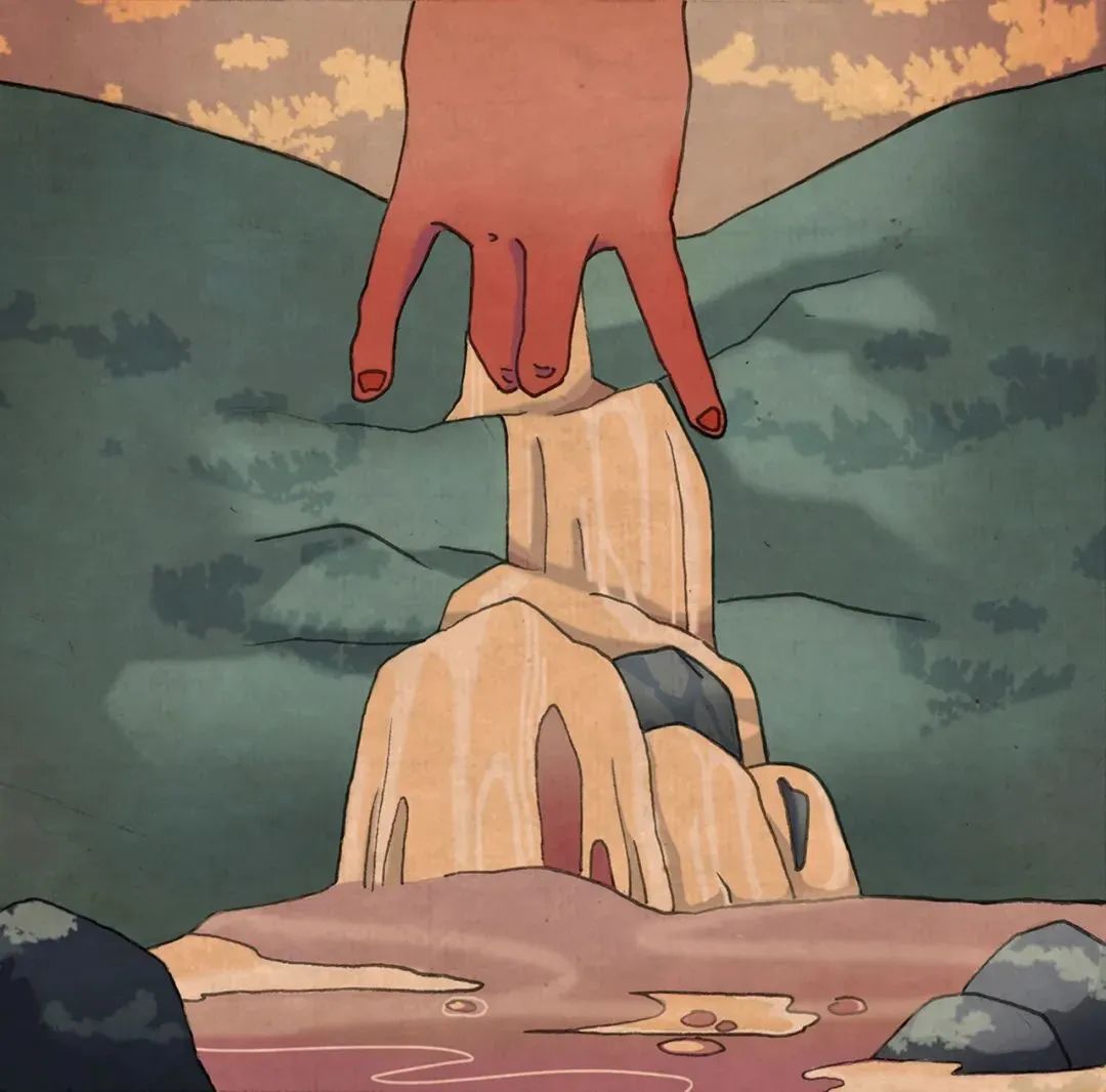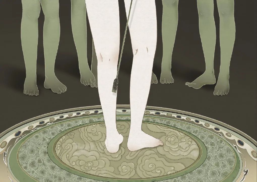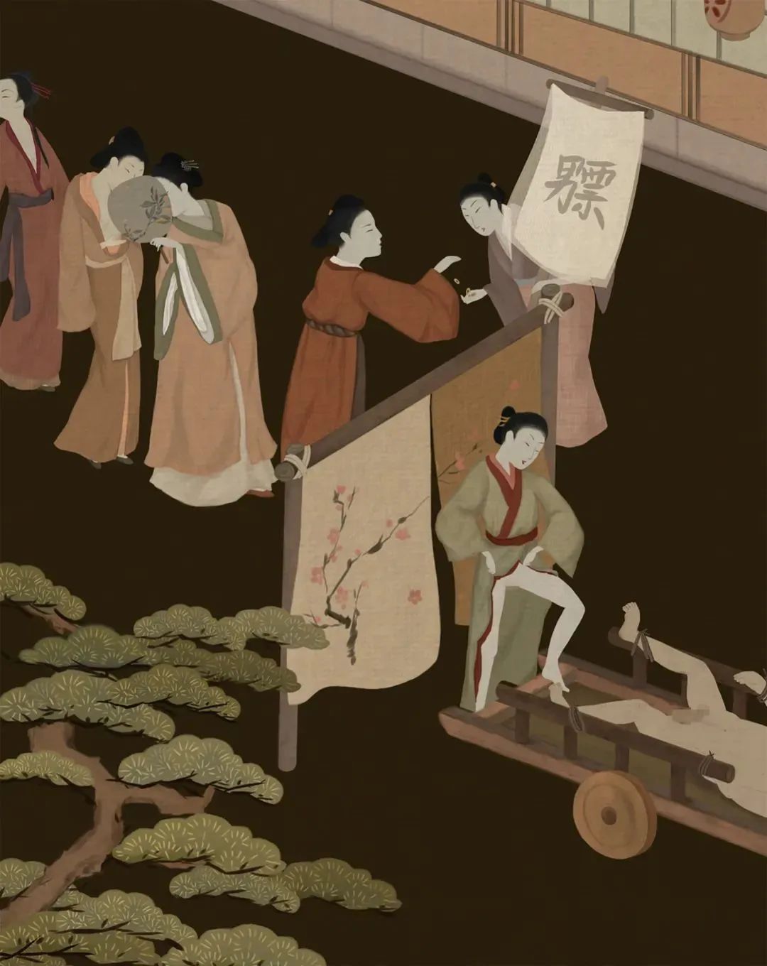 以男性生殖器官为山,渺小的赤身女子穿梭其中,