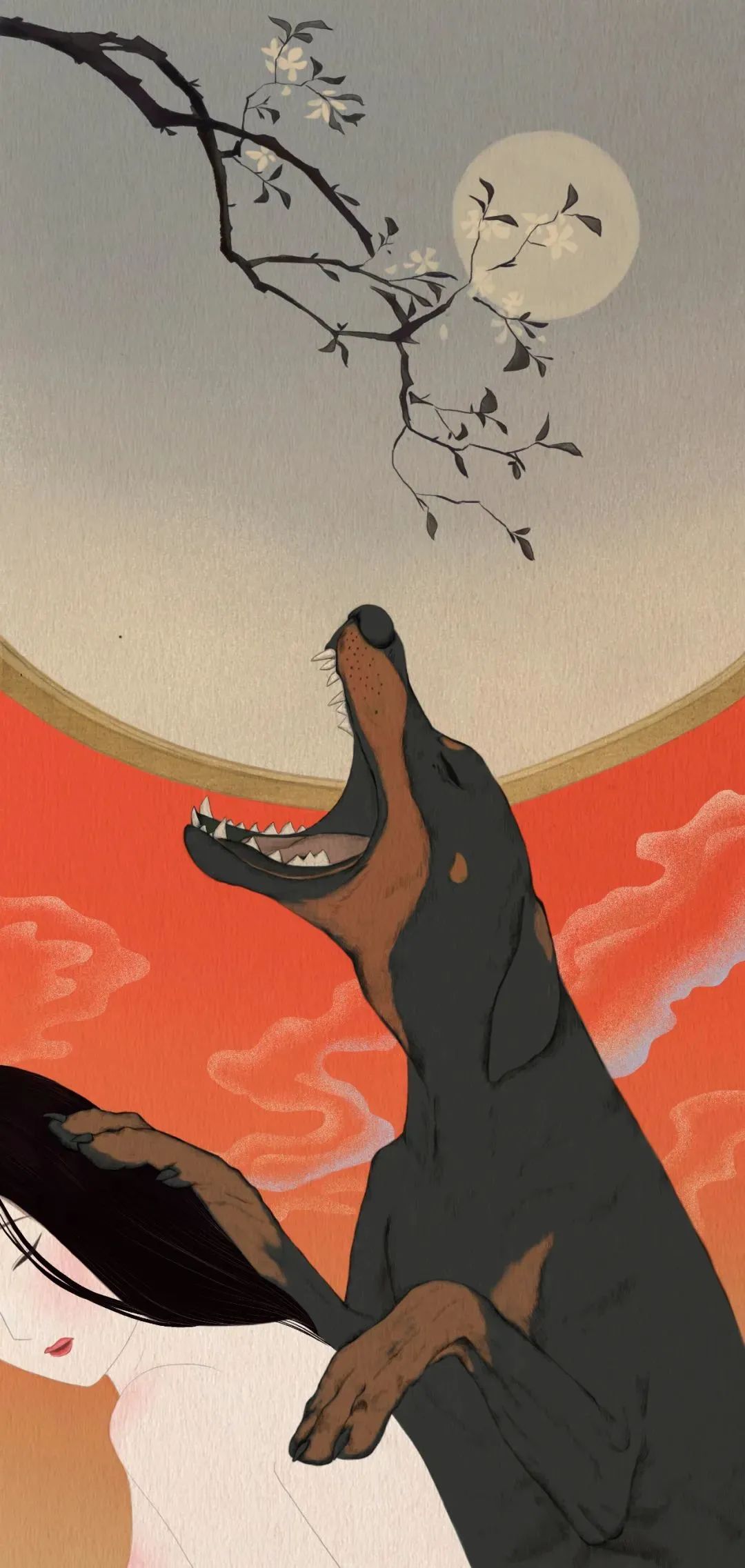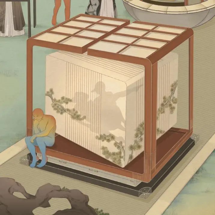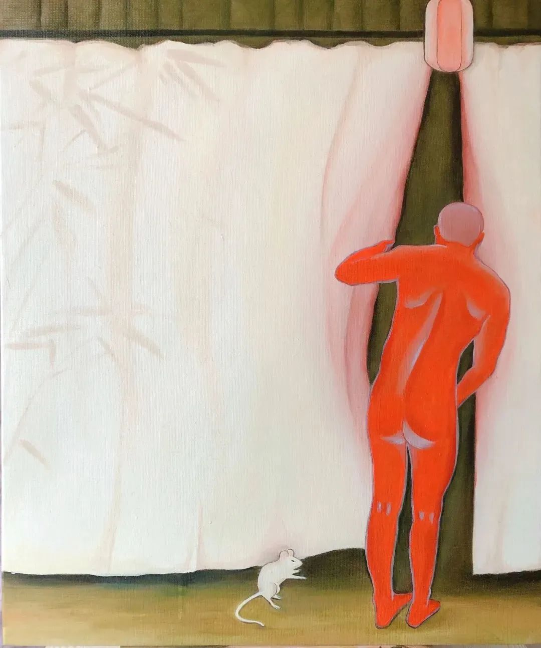 红色的裸身男子掀开帘子,仿佛在窥探着什么,