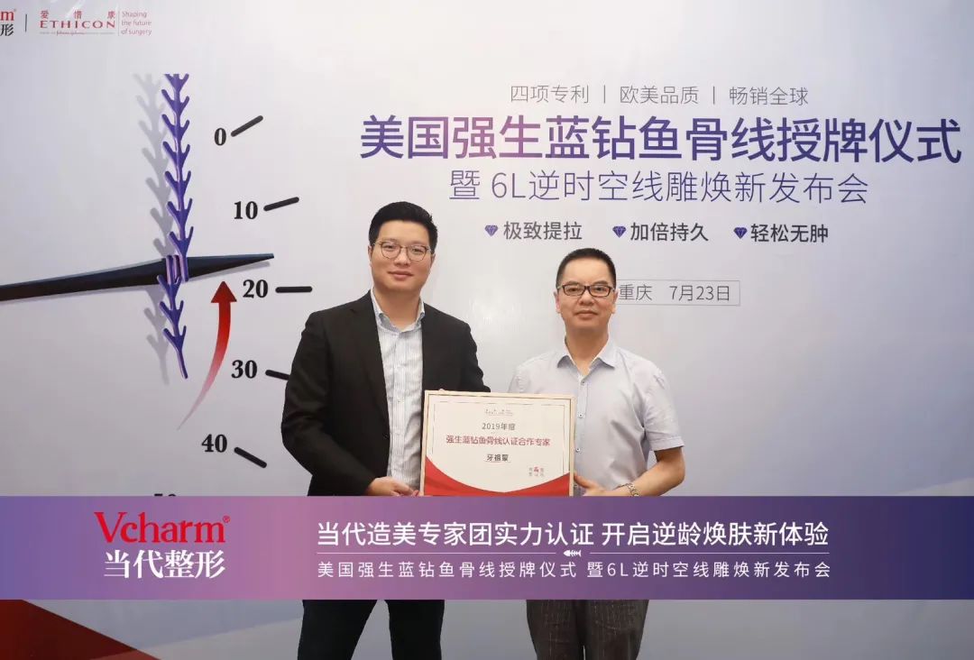 △美国强生蓝钻鱼骨线授牌仪式留影,牙祖蒙院长(图右)与厂家代表