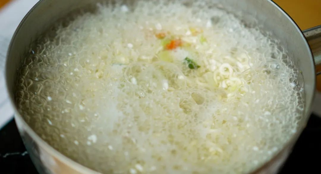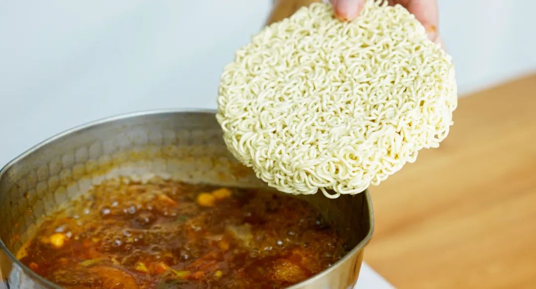 ▼ 1.煮泡面:水煮开后加入面饼和蔬菜包。