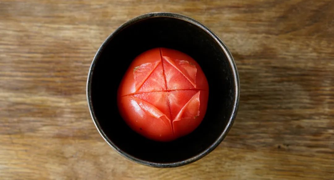 ▼ 1.煮番茄汤:西红柿顶部划开十字切口,放入碗中,冲入开水,烫1分钟,烫到西红柿皮裂开。捞出放到不烫手,剥去皮,切片。