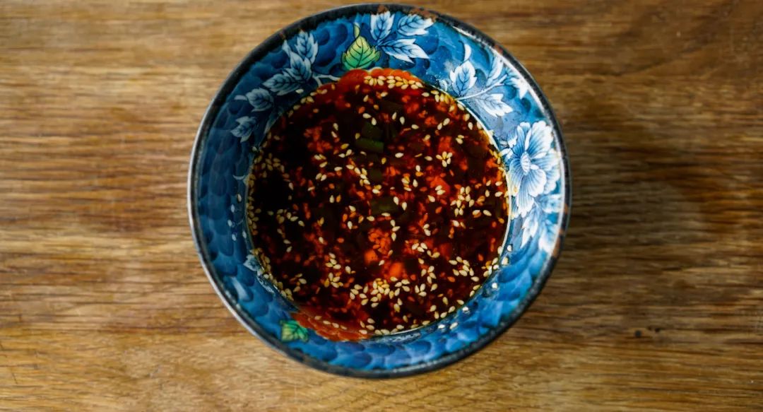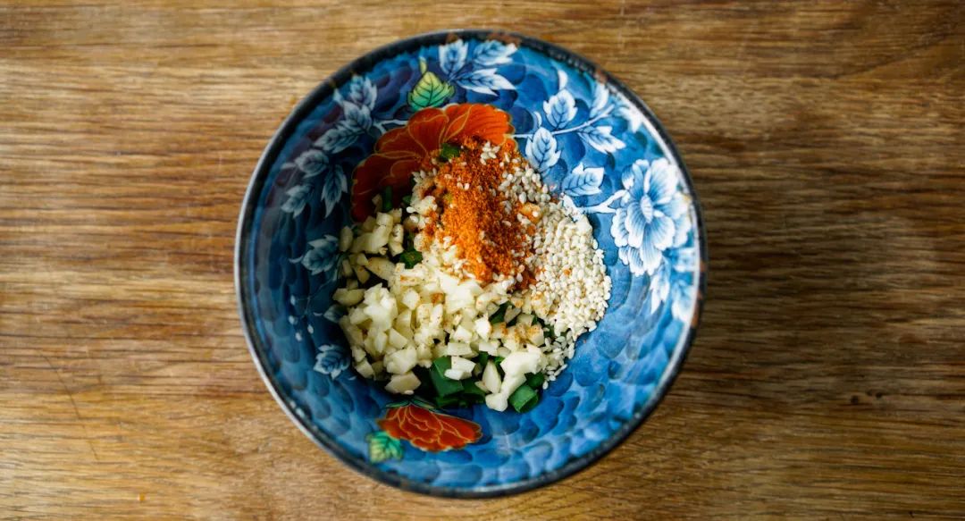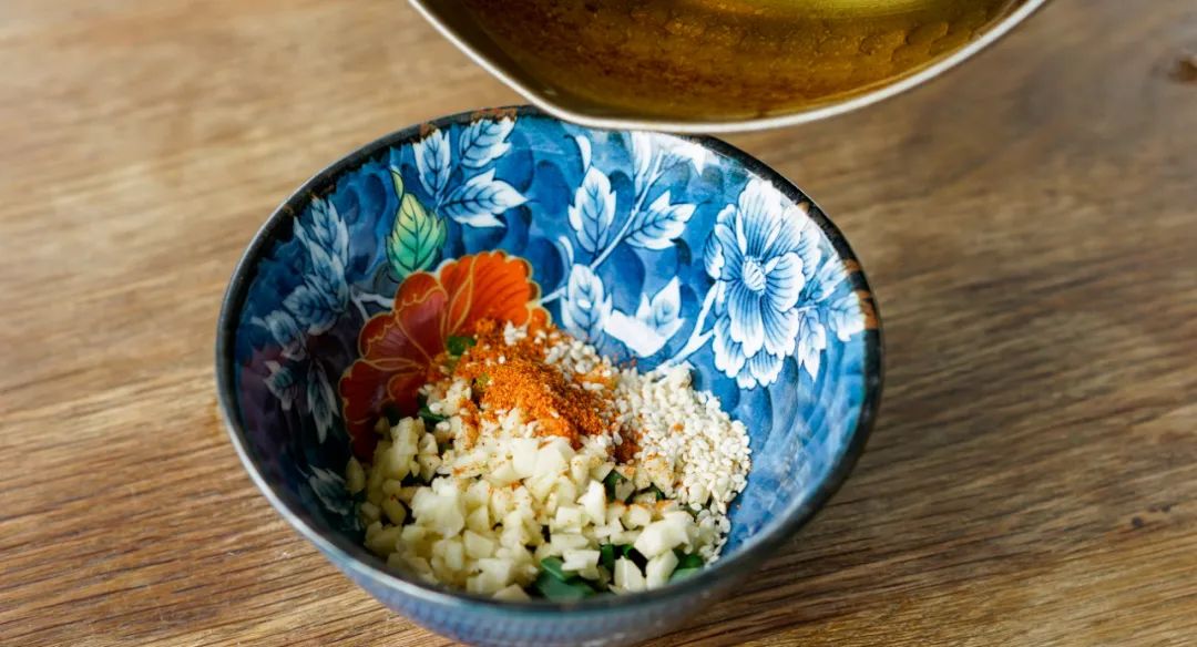 ▼ 1.拌酱汁:碗中放蒜末、葱花、辣椒粉、白芝麻。