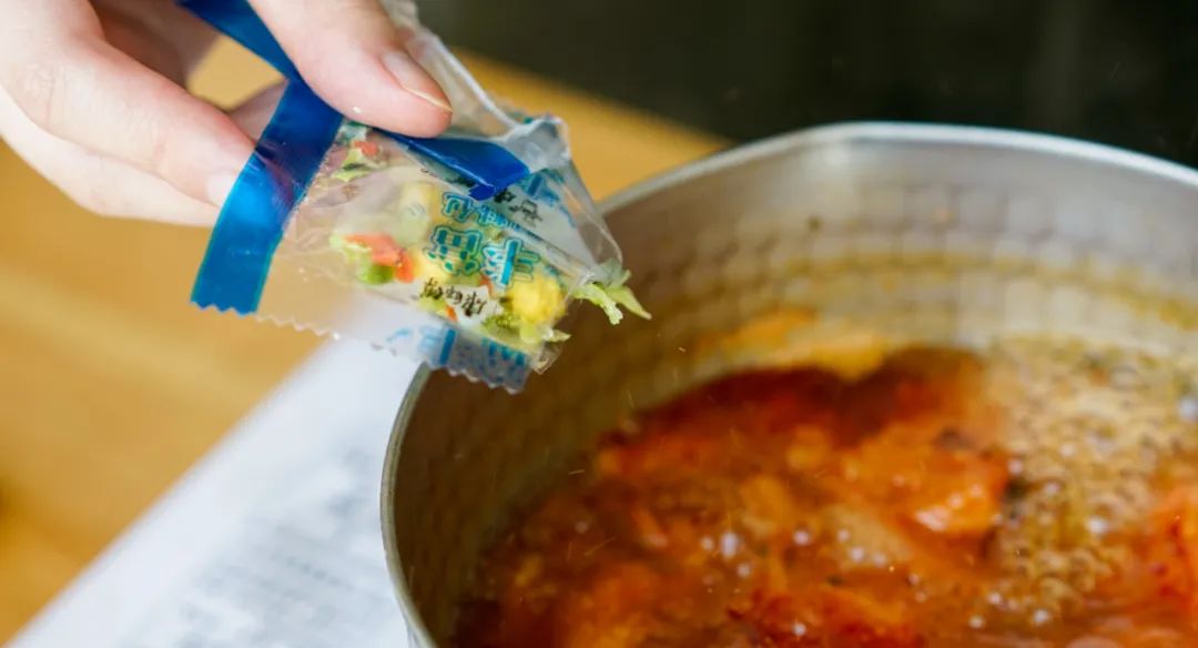 ▼ 2.煮面:放方便面的蔬菜包,煮到蔬菜吸水恢复新鲜状态。加入粉末调料,煮30秒,煮到粉末调料融入汤汁。放入酱料包,继续煮1分钟,煮成一锅浓汤。