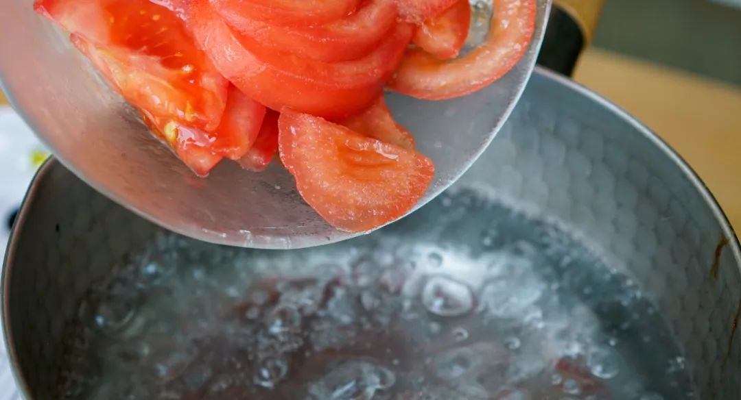 锅中放入500毫升水,大火煮开,放入西红柿,转中火煮3到5分钟,煮到西红柿软烂,汤汁浓稠。