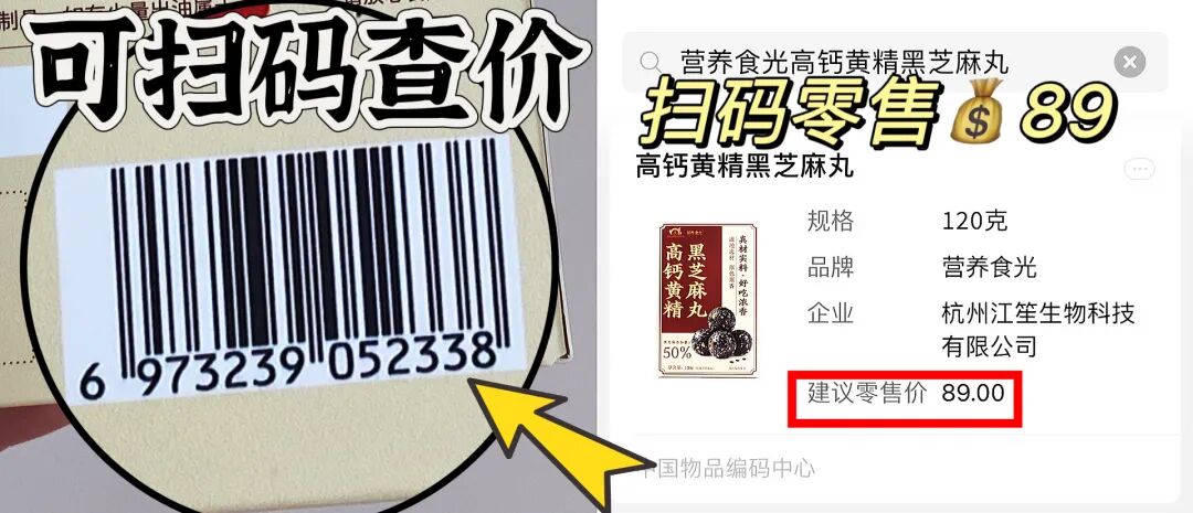 扫码零售89元/盒的正品李时珍出品的营养食光高钙黄精黑芝麻丸
