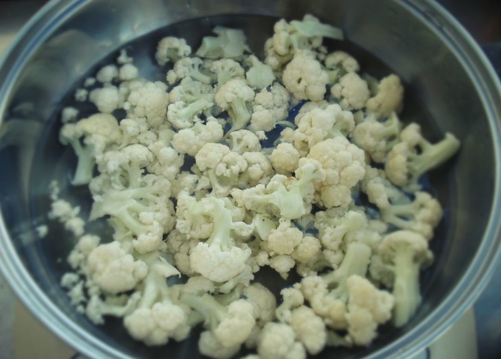2、将菜花放入开水中焯3分钟,捞出过凉,沥干水分盛入盘中备用;