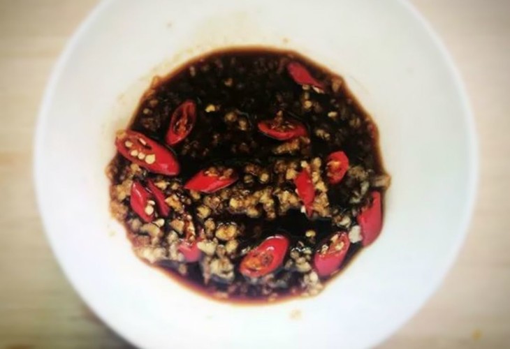 2、将辣椒段与蒜末混合好,浇入热油,添1勺生抽,半勺陈醋,半勺白糖搅匀;