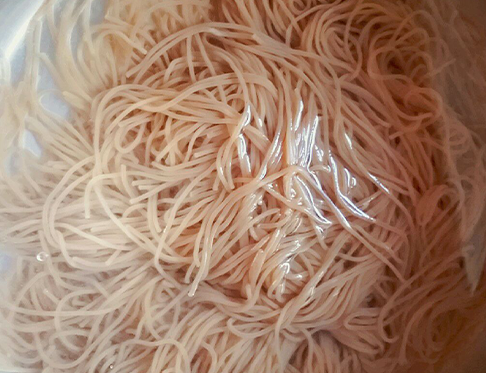 1、把冷面放入烧开水的锅里,煮1分半至2分钟,待冷面漂起后立即盛出放入流水中冲,控干水份放入碗里;