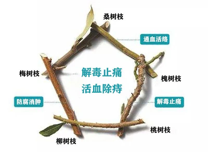 配上桑枝、槐枝,桃枝,柳枝、梅枝,5味滋血脉,润肌肤,活血养血润肠,解毒止痛,防腐消肿。