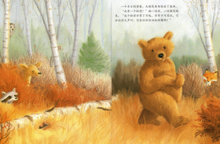 又比如在《大棕熊有个秘密》的故事里,一个冬日的黄昏,大棕熊匆匆钻出了森林,“我有一个秘密!非常了不起,非常不可思议,它会让你大声叫,它会让你乐得转圈跳!”
