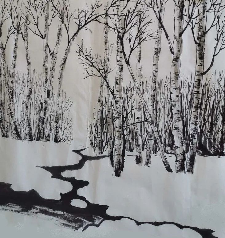 第二步:画出桦树干的外轮廓,在用笔檫出桦树皮的效果,在画出枝干。在用中等墨色,画出中景的树木。