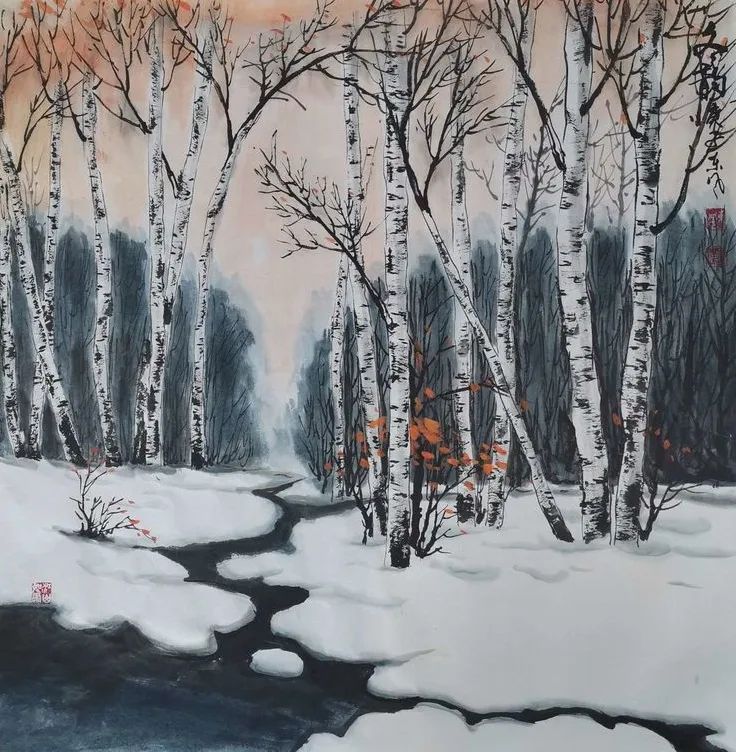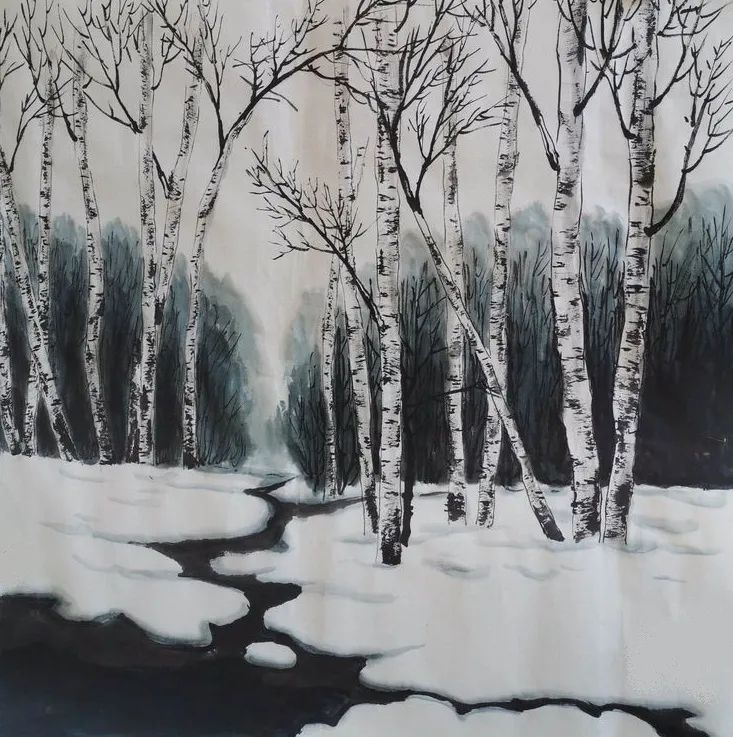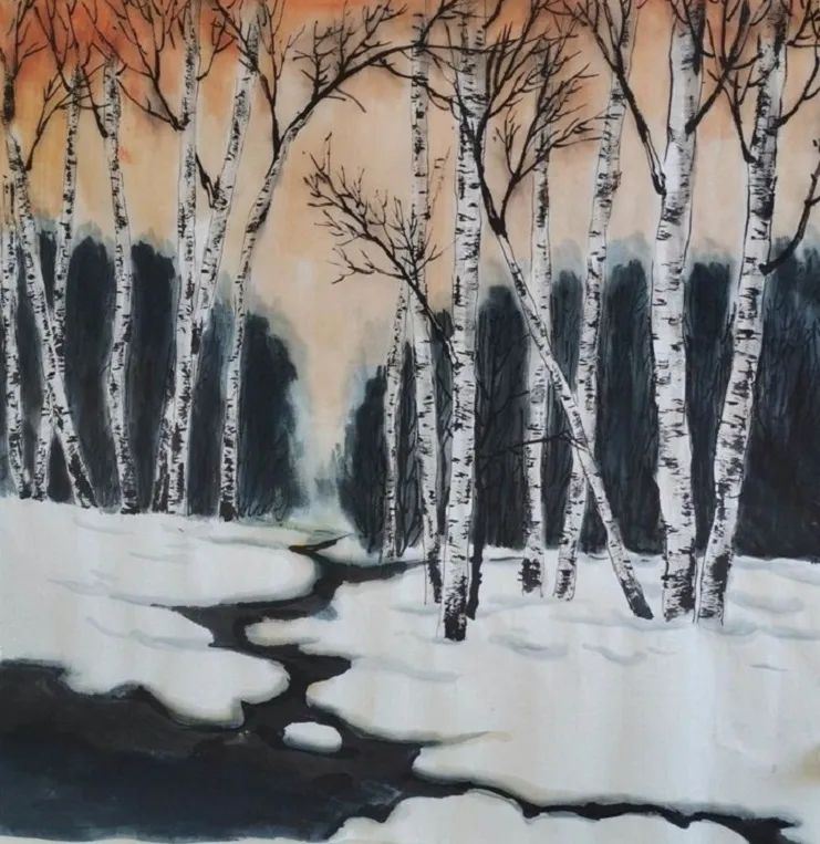 第三步:用墨花青色渲染不冻河及中景的树木。注意留好桦树干的白。