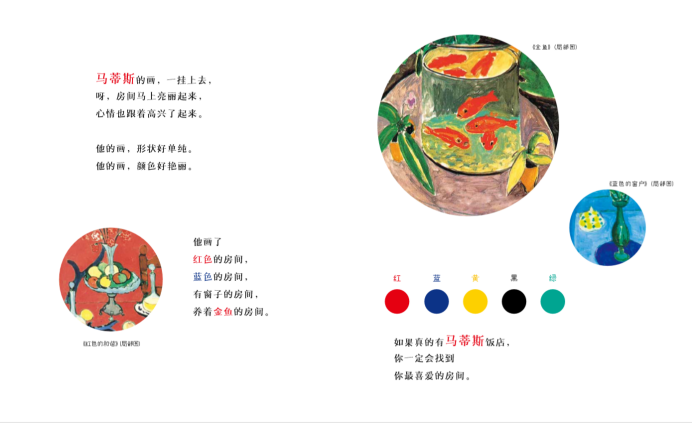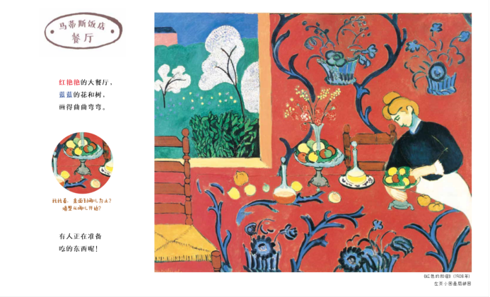 比如在《马蒂斯》这本中,她就创设了一个去“马蒂斯的饭店里住一住”的场景。