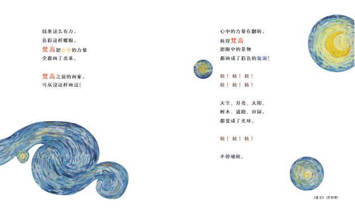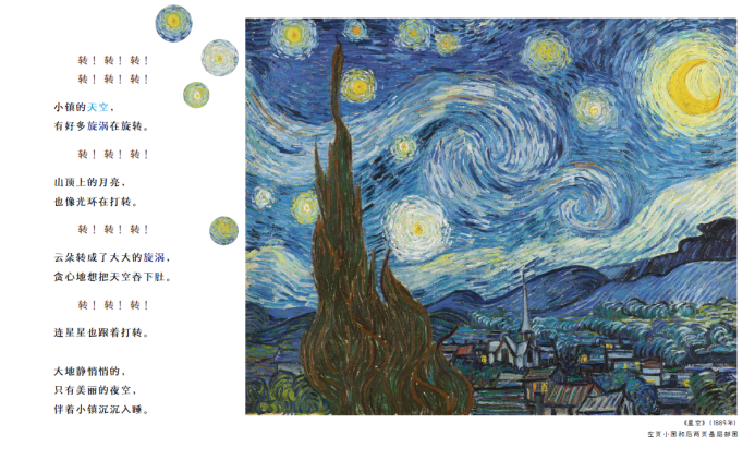 作者抓住梵高画中常常出现“旋涡”状景物这一特点,提示孩子们这种独特的“旋涡”画法,与画家内心强烈的情感和力量有关。
