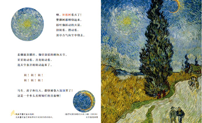 比如,当欣赏《普罗旺斯夜间的乡间小路》时,作者用充满惊奇的语气说道:“呀,丝柏树着火了……”马上抓住了孩子们的注意力——